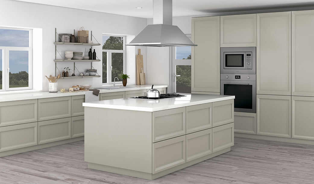 Las puertas de estilo shaker, de color gris perla, resaltan sobre un fondo blanco y fresco en una cocina moderna. Nos encanta esta combinación de colores para nuestro modelo Denver porque es neutra y elegante a la vez.